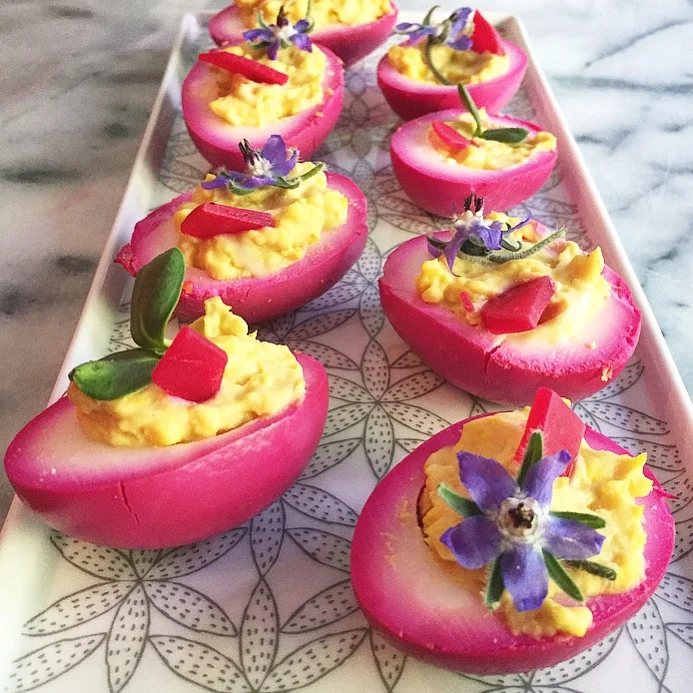 Beet-Pickled Deviled Eggs with Purple Potato Chips
