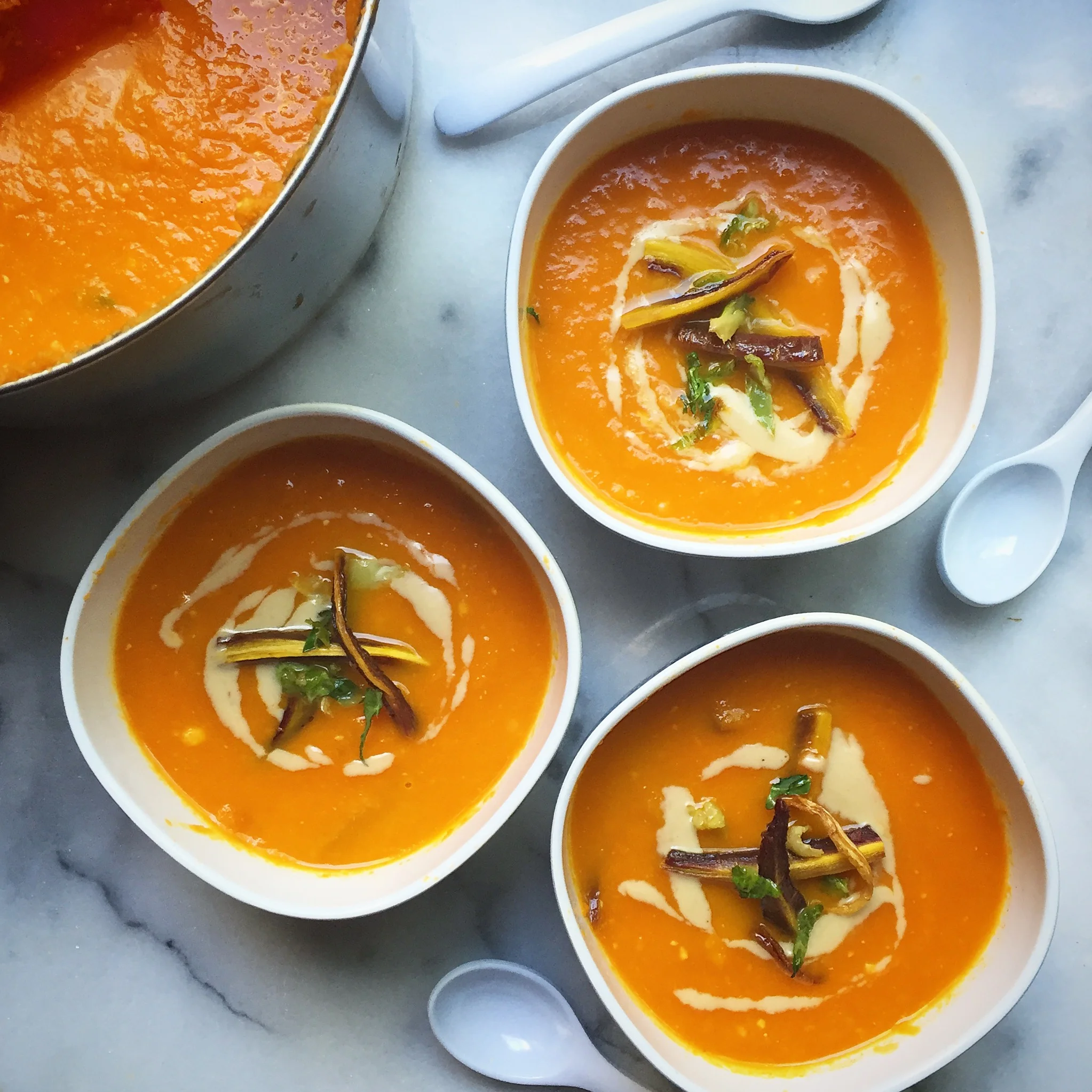 ASSEMBLE THE SOUP: Remove 1 cup of the soup from the blender and place back into the pot. Add miso to the soup and stir until smooth. Once smooth, add the remaining soup back into the pot and simmer for 2 or 3 minutes (miso should not be boiled because it will kill the beneficial bacteria). At this time you can add the remaining ½ cup of water thin the soup to the desired consistency. Evenly divide soup among 4 bowls. Top each bowl with 1 tablespoon of tahini and a few roasted carrots. Serve and enjoy!!
